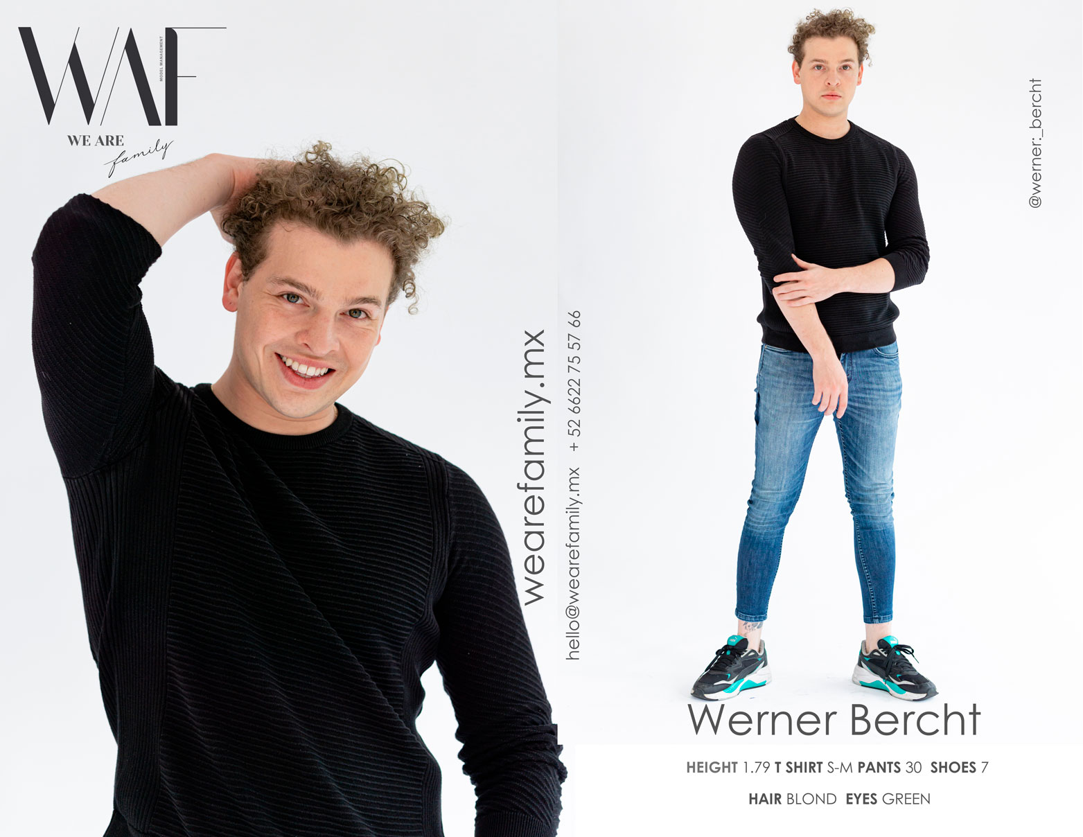 HEIGHT: 1.79 SHOES: 7 T SHIRT: S – M PANTS: 30 HAIR: BLOND EYES: GREEN